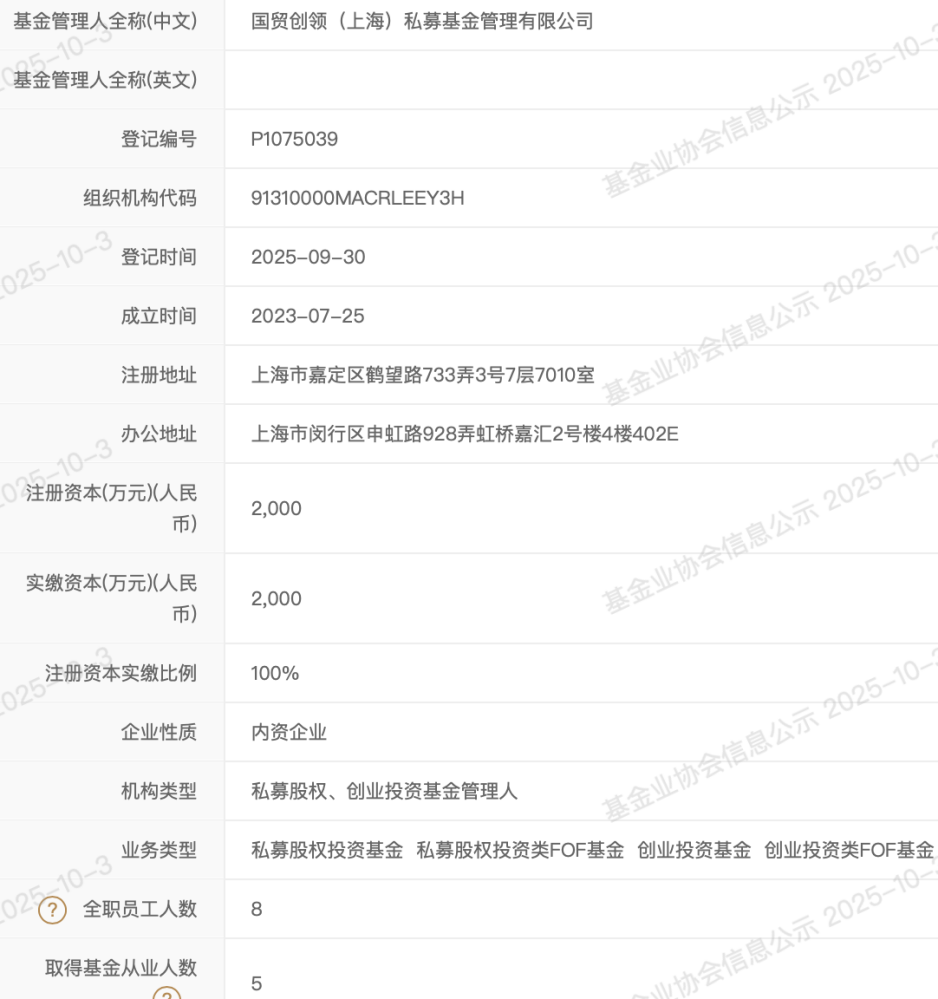 具体来看,国贸创领私募成立于2023年7月25日,注册资本为2000万元,注册于上海嘉定,办公地位于闵行,目前有8名全职员工。该公司于2025年9月30日完成私募管理人备案登记,机构类型是私募股权、创业投资基金管理人。