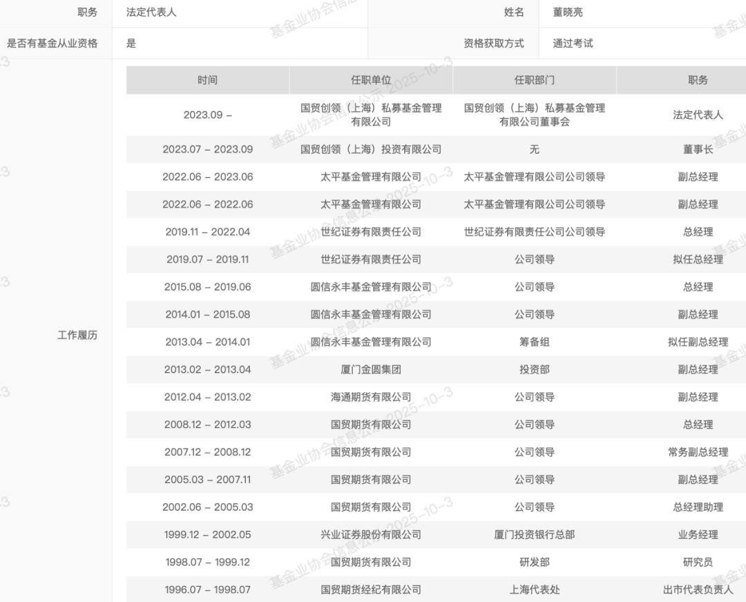 值得注意的是,国贸创领私募法定代表人董晓亮,是一位有着近30年金融从业经验的老将,职业生涯足迹遍布期货、证券、基金等多个领域,曾任多个金融机构的总经理,与厦门国贸体系渊源颇深。