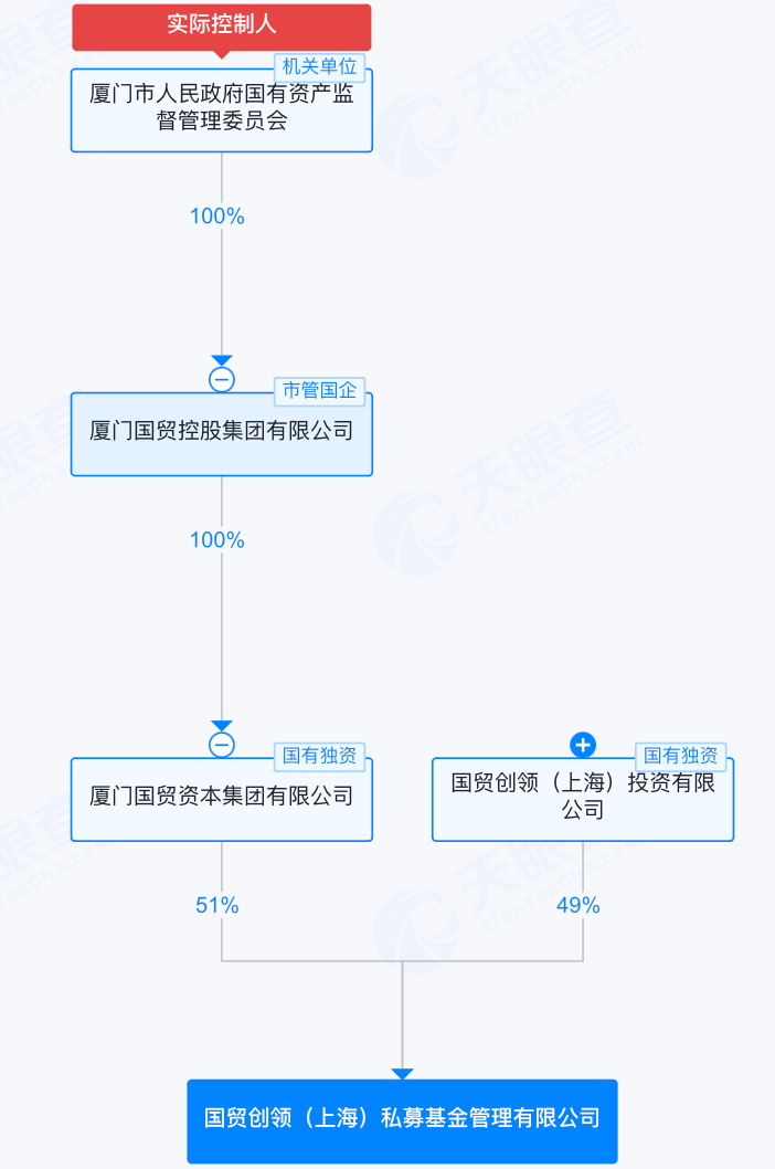 国贸创领私募的股东是厦门国贸资本、国贸创领(上海)投资有限公司(以下简称国贸创领),分别持股51%、49%。厦门国贸资本是厦门国贸控股集团有限公司的全资子公司,背后实控人是厦门市国资委。