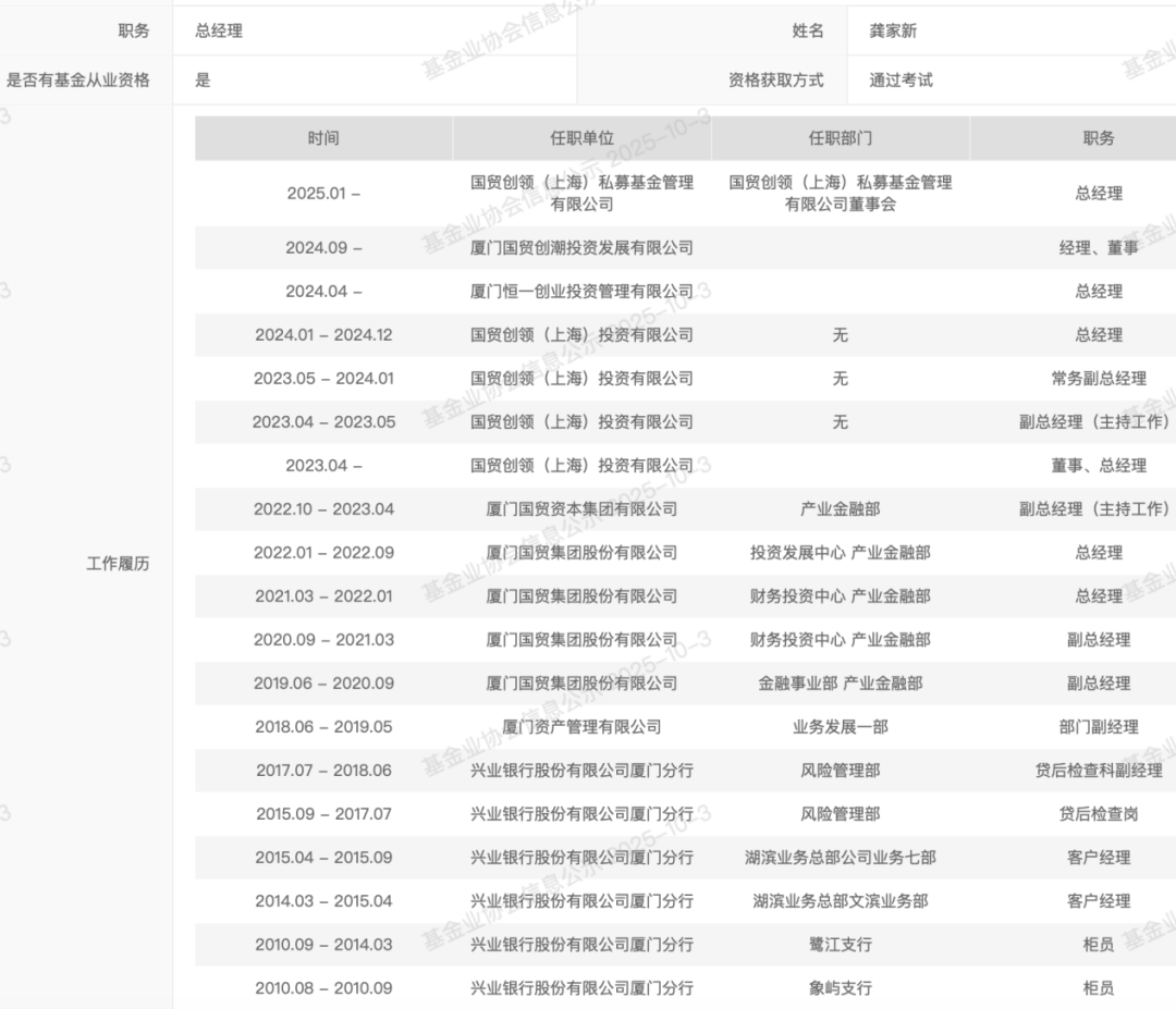 值得一提的是,国贸创领私募的核心团队配置兼具“国资基因”与“市场化经验”。除董晓亮外,国贸创领私募的总经理龚家新,拥有15年从业经验,曾在兴业银行厦门分行、厦门资产任职;2019年6月加入厦门国贸集团,担任财务投资中心、产业金融部总经理等职务;2023年4月加入国贸创领私募,先后担任副总经理、总经理等。