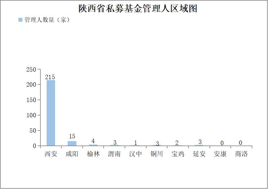 管理人按照区域划分,相关数据如下:西安共计215家,占比87.40%;咸阳共计15家,占比6.10%;榆林共计4家,占比1.63%;渭南共计3家,占比1.22%;汉中共计1家,占比0.41%;铜川共计3家,占比1.22%;宝鸡共计2家,占比0.82%;延安共计3家,占比1.22%;安康、商洛目前暂无登记的私募基金管理人。统计数据如下图所示: