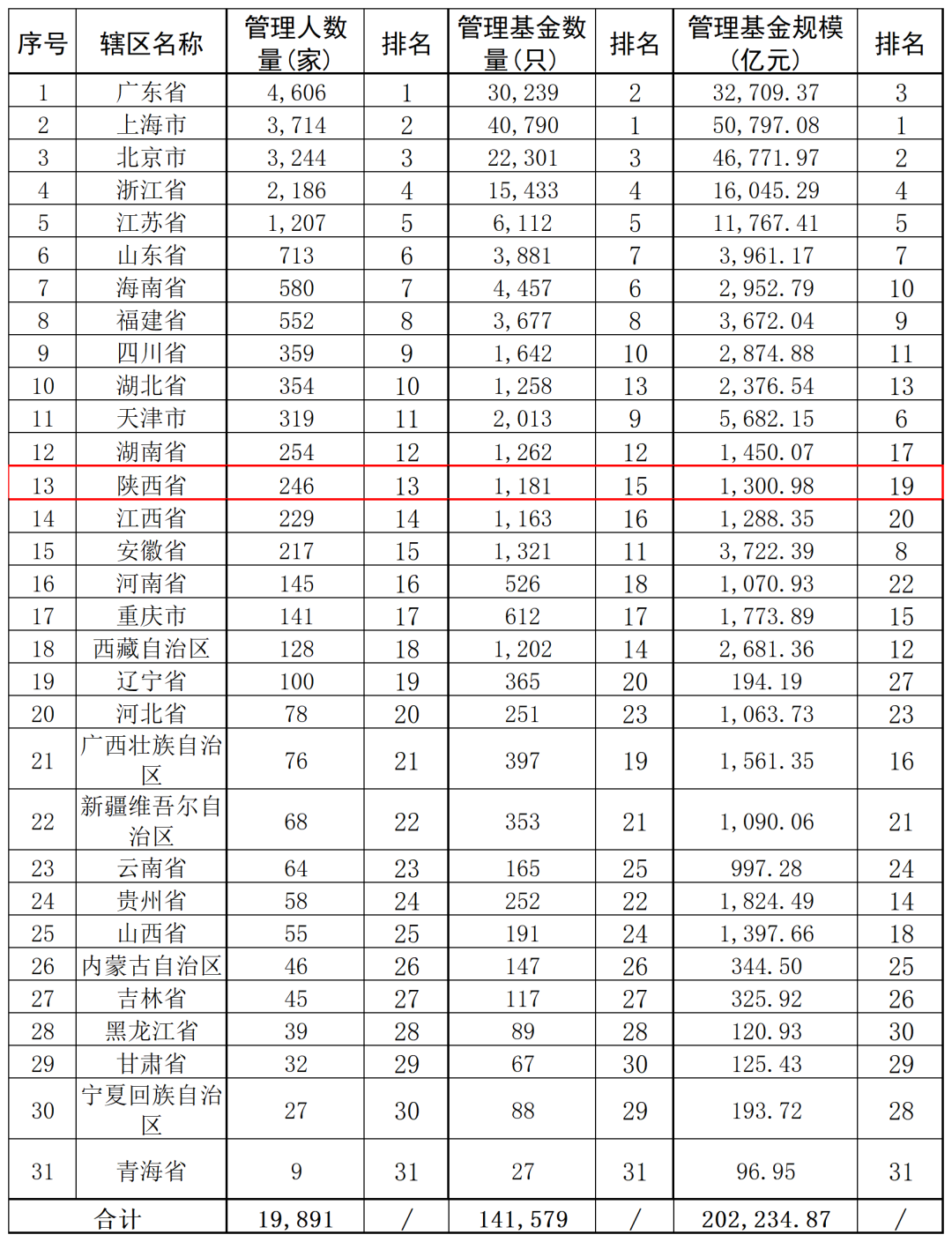 陕西省私募基金总规模1300.98亿元(按照基金管理人注册地口径统计),比上年同期增加了31.52亿元,比上月增加了50.35亿元。在全国占比0.64%,全国排名第19位。