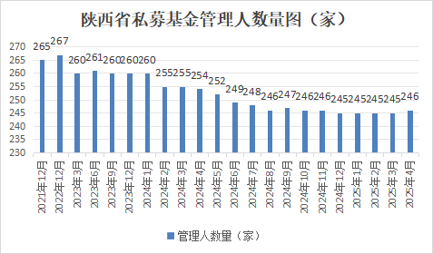 截至2025年4月末,按照注册地口径统计,陕西省私募基金管理人246家,其中证券类管理人64家,股权类管理人181家,其他类管理人1家。