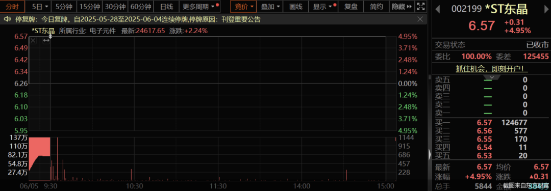 受上述消息影响,*ST东晶6月5日复牌涨停,公司当日报涨停价6.57元/股,最新总市值约为15.99亿元,当日成交金额384万元。