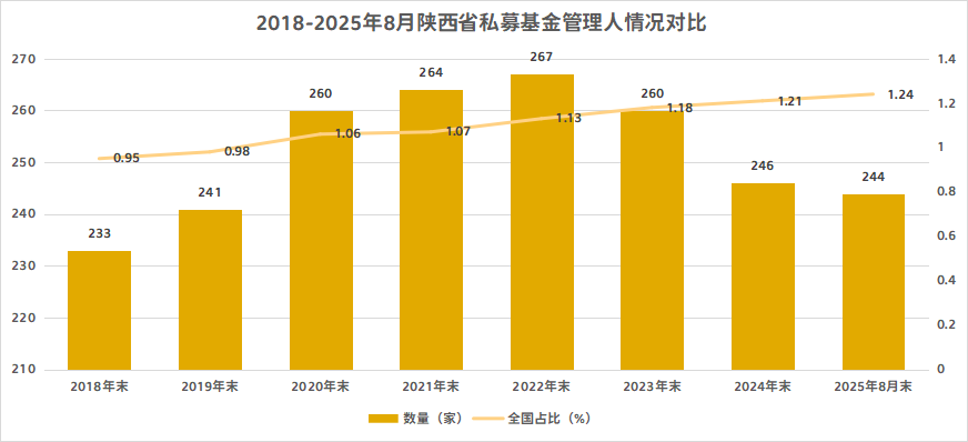截至2025年8月末,陕西省存续登记私募基金管理人数量 244,在全国占比1.24%;