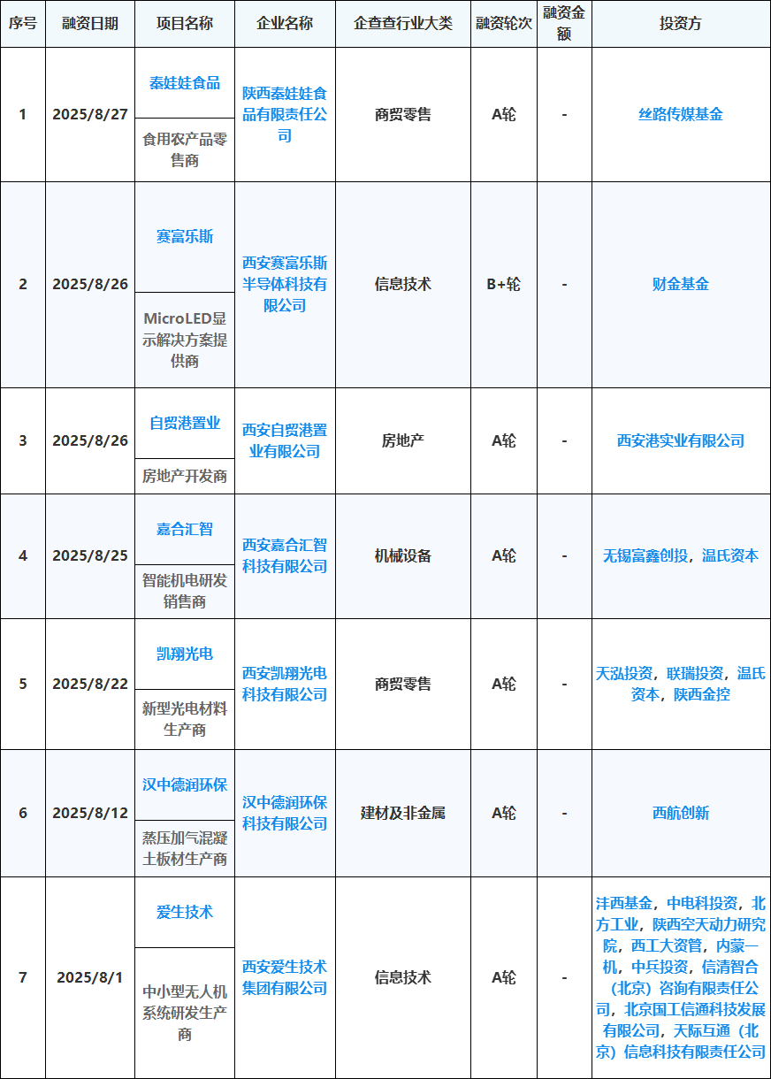 2025年8月,根据公开投融资信息不完全统计,陕西省共发生投融资事件17起。