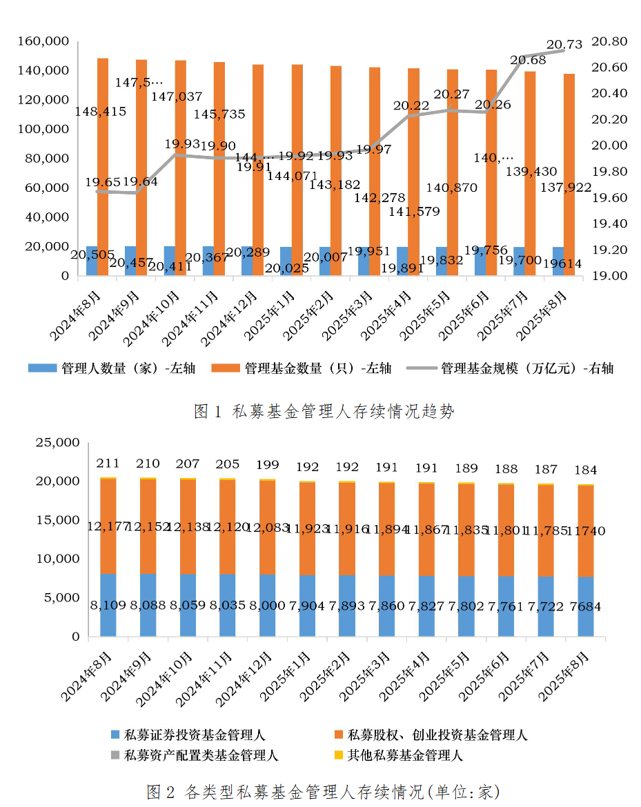 截至2025年8月末,中国证券投资基金业协会存续私募基金管理人 19,614 家。其中,私募证券投资基金管理人 7,684 家,私募股权、创业投资基金管理人 11,740 家,私募资产配置类基金管理人 6 家,其他私募投资基金管理人 184 家。2025年8月,协会注销私募基金管理人 94 家。存续私募基金数量 137,922 只;管理基金规模 20.73万 亿元。