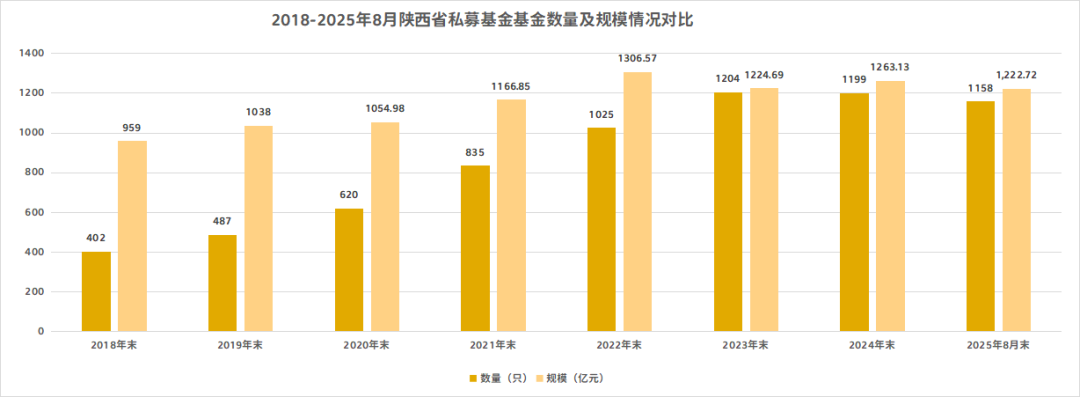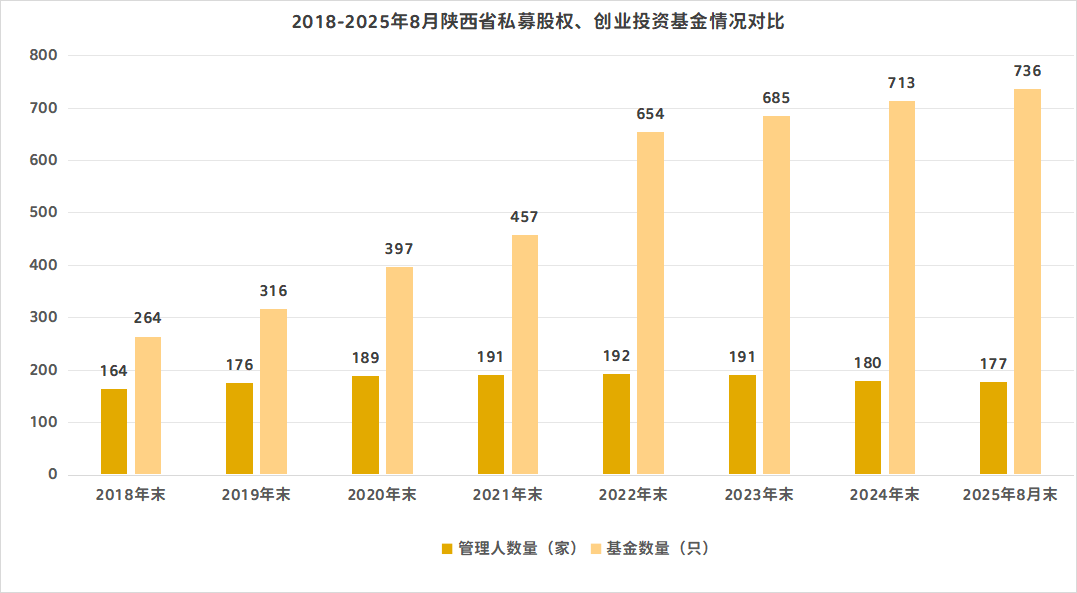 下图为2018-2025年8月陕西省七年陕西省私募股权、创业投资基金规模情况对比。8月创业投资基金管理人数量比2024年8月减少 4 家,基金数量较2024年8月增加39只。