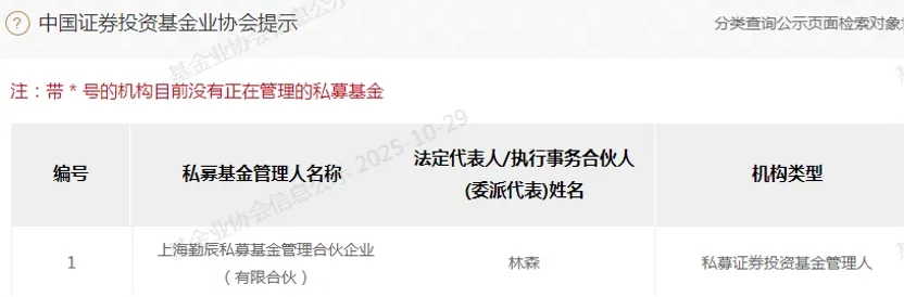 另外,协会信息亦显示,林森现任上海勤辰私募基金管理合伙企业(有限合伙)的法定代表人及执行事务合伙人(委派代表)。