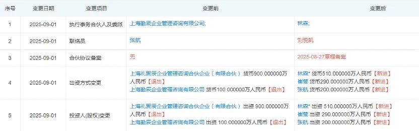 9月1日,勤辰基金的执行事务合伙人由“上海勤辰企业管理咨询有限公司”变更为林森个人;同一天,公司联络员由刘悦凯变更为张航,并备案了新的合伙协议。