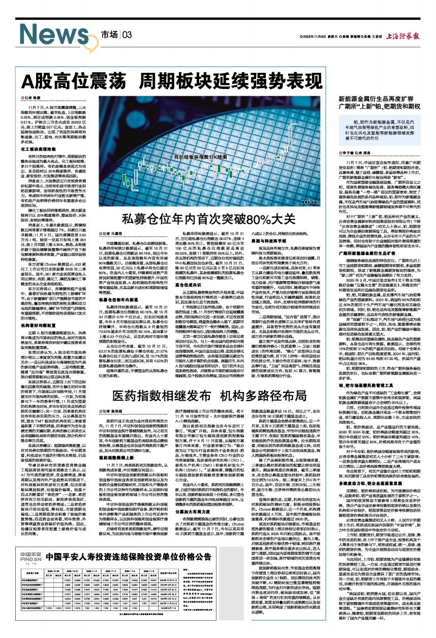 市场震荡加剧,私募仓位却频创新高。私募排排网统计数据显示,截至10月31日,股票私募仓位指数达80.16%,创出今年以来的新高,且是该指数年内首次突破80%整数关口。分规模来看,头部私募仓位攻势明显,50亿元以上私募平均仓位超过80%。在业内人士看来,伴随着权益资产在居民财富配置中的重要性持续提升,中国优势产业快速发展,A股和港股的结构性行情有望延续,尤其是新兴成长和周期领域值得挖掘。