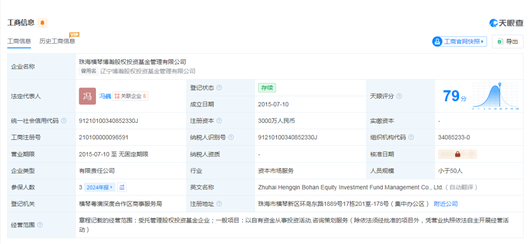 查阅天眼查显示,横琴博瀚曾用名为“辽宁博瀚股权投资基金管理有限公司”,成立于2015年7月,注册资本3000万元,法定代表人为冯巍。